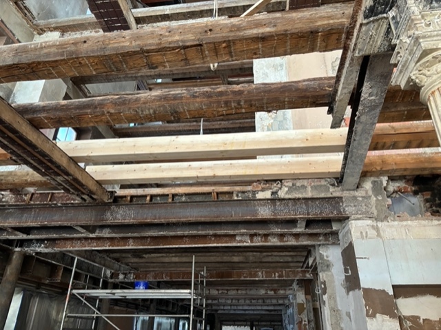 Auch an der Fassade wird aktuell gearbeitet: Putz-, Stuck- und Anstricharbeiten werden auf einer Fläche von rund 1.300 m² umgesetzt.